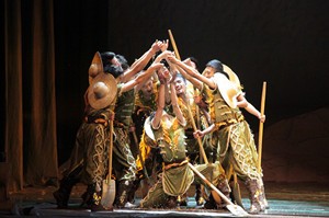 2010年8月达拉特旗乌兰牧骑参加第七届中国荷花杯舞蹈大赛《借风扬场》剧照。