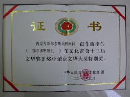 2006年8月荣获“全区两个文明建设经验交流会中国内蒙古第三届国际草原文化节暨首届鄂尔多斯国际文化节专业文艺调演”演出特别奖
